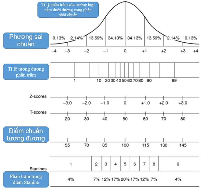 b. Xếp hạng phần trăm. Xếp hạng phần trăm cho biết tỷ lệ dân số bình thường đạt điểm thấp hơn trong các chủ đề của bài kiểm tra. Điểm trung bình cho một bài kiểm tra phải là điểm ở phân vị thứ 50. Điểm ở phân vị thứ 10 có nghĩa là chỉ có 10% dân số mẫu chuẩn đạt được dưới điểm của khách hàng. Hình dưới cho cách điểm số phân vị phù hợp với các điểm số tiêu chuẩn khác bằng cách chỉ ra cách điểm số phân vị liên quan đến sự phân bố lý thuyết của các điểm số trong một đường cong chuẩn. Điểm xếp hạng phần trăm dễ hiểu và dễ hình dung, và cũng dễ diễn giải, thường rất hữu ích để thảo luận về thành tích của trẻ với cha mẹ và giáo viên. Nhưng chúng không đại diện cho một thang đo khoảng bằng nhau, như các thang điểm số tiêu chuẩn. Như vậy, khoảng cách giữa các cấp- bậc không có lượng bằng nhau.