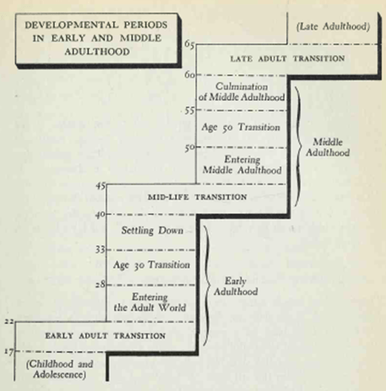 Chuỗi các giai đoạn bắt đầu với Sự chuyển đổi giai đoạn trưởng thành sớm(17 đến 22 tuổi), liên kết giữa tuổi vị thành niên và tuổi trưởng thành sớm. Tiếp theo là giai đoạn xây dựng cấu trúc, Bước vào Thế giới Người lớn, kéo dài từ khoảng 22 đến 28; nhiệm vụ chính của giai đoạn này là tạo ra một cấu trúc cuộc sống trưởng thành đầu tiên. Cấu trúc này được sửa đổi trong Chuyển đổi Tuổi Ba mươi. Trong thời kỳ Định cư (33 đến 40), một người đàn ông xây dựng cấu trúc thứ hai và đạt đến đỉnh điểm ở tuổi trưởng thành sớm. Giai đoạn chuyển tiếp giữa cuộc đời, từ khoảng 40 đến 45, liên quan đến giai đoạn trưởng thành sớm và giữa. Tiếp theo là một giai đoạn ổn định hơn, trong khoảng giữa và cuối những năm bốn mươi, khi một người đàn ông xây dựng cấu trúc cuộc sống đầu tiên cho tuổi trưởng thành giữa.