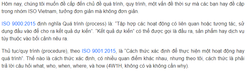 Tuy nhiên, nếu hiểu như vậy, để ra một kết quả dự kiến, có thể có nhiều quá trình. Đặc biệt với một hoạt động nhận thức. Nên khi đó, người ta không quá chú trọng quá trình, mà chú trọng nhiều vào quy trình. Nhưng một quy trình tốt phải gắn được với quá trình thực. Có rất nhiều quy trình xây dựng trên giời, chẳng gắn với quá trình nào. Thậm chí người ta chỉ đi sao chép một quy trình “quốc tế”, khen nó tiến bộ, nhưng thật tiếc, nó không gắn với quá trình thực ở VN. Và đúng là có rất nhiều sự nhầm lẫn không nên có, khiến tranh luận tích cực khó xảy ra, chỉ vì không phân biệt tốt hai việc khác nhau.